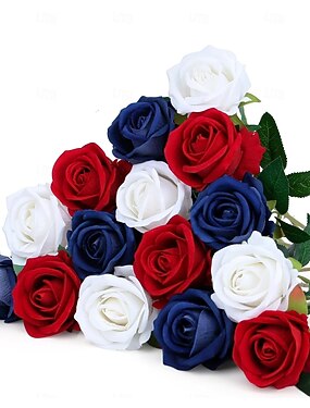 15 künstliche Seidenblumen zum 4. Juli, patriotischer Blumenstrauß mit langen Stielen, für die Dekoration von Zuhause und Tischen zum Unabhängigkeitstag, gemischt in 3 Farben