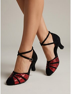 Vintage-Pumps im Stil der 1920er Jahre, inspiriert von „Der große Gatsby“, aus schwarzem Wildleder – elegante rote Glitzer-Pumps mit Knöchelriemen für Flapper-Partys und Retro-Tanzveranstaltungen.