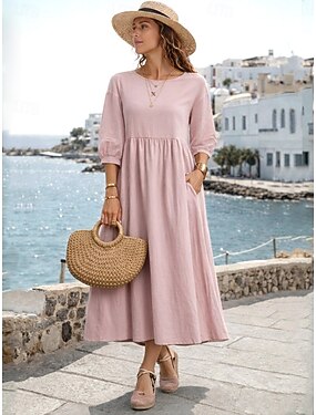 Damen Midikleid Kunstbaumwollleinen A Linie Kleid Lässig Täglich Normale Passform Einfach Dreiviertelarm Rundhalsausschnitt Blau Weiß Hellgrün Rosa Sommer Frühling Herbst