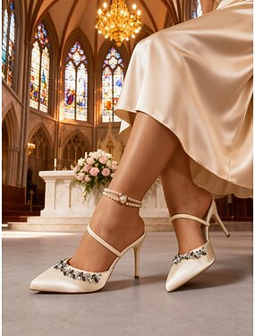 Elfenbeinfarbene Satin-Pumps für Damen – elegante Pumps mit spitzer Zehenpartie und Kristallverzierungen &Elegante, schmal geschnittene Schuhe mit Riemen für die Mutter der Braut, geeignet für