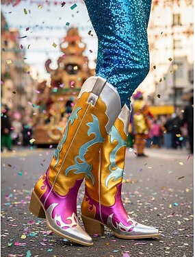 Damen Mardi Gras farbenfrohe metallische Cowboy-Stiefel für den Karneval - Silber Pink und Orange Blockabsatz festivalbereit