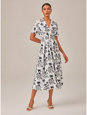 Damen Weiblich Freizeitkleid Midikleid Schwarz-Weiß Kurze Ärmel Blumenmuster Palme Palmblatt Drucken Sommer V Ausschnitt Urlaub Lässig Freizeit XS S M