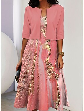 Damen Zwei-Teiler Kleid Sets Midi Kleid mit Jacke Elegantes A-Linien Kleid Halbarm Casual Semi Formal Ombre Grafikdruck V-Ausschnitt Date Schwarz Pink Rot Frühling Herbst Regelmäßige Passform