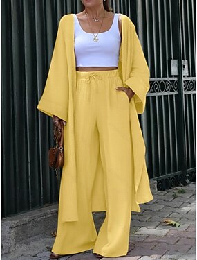 Damen-Hosen-Set aus Leinenimitat, Bolero-Top, langärmlig, einfarbig, Kordelzug, modisch, Streetwear, lässig, für Alltag, Outdoor, Sommer, lockere Passform