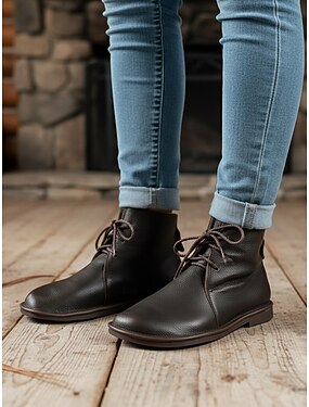 Damen-Stiefeletten aus echtem Leder in Kaffeebraun mit Schnürung, lässige Vintage-Stiefeletten mit runder Spitze, flacher Stiefeletten, bequemer Herbst &Winterschuhe für den Alltag und Outdoor-Outfits