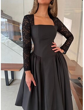 A-Linie Tee-Länge Abiballkleider Elegant Langarm Quadrathals Gartenparty Hochzeit Spitze Stretch-Crêpe mit Gerafft Tasche