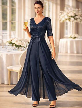 Overall Hosenanzug Knöchellänge Brautmutterkleid Halbarm Rundausschnitt Elegant Formell Hochzeitsgast Chiffon Paillettenbesetzt mit Schleife(n) Paillette