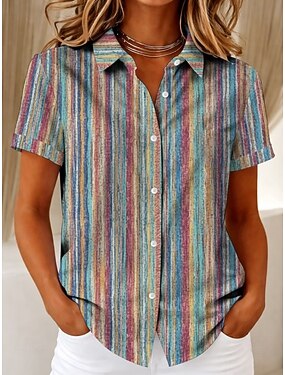 Damen Hemd Grafik Geometrisch Gestreift Vintage Tropisch Stilvoll Kurzarm Hemdkragen Normale Oberteile Täglich Blau Gras-Grün Grün Sommer Frühling