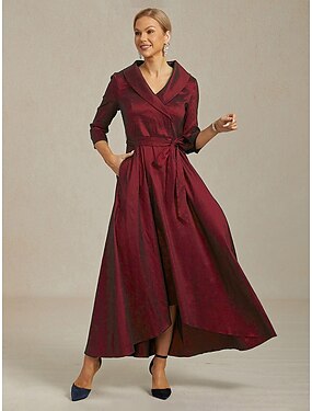 Elegantes Maxikleid aus Taft mit Tasche, ideal für Hochzeiten, Abendveranstaltungen und andere Feierlichkeiten. Normale Passform, einfarbig, 3/4-Ärmel, V-Ausschnitt, rot, für Frühling, Herbst und