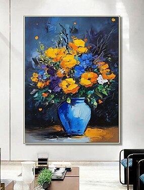Großes abstraktes Blumenstraußgemälde, handgefertigte Leinwand-Wandkunst, bunte Blumen in Vase, handgemaltes Blumengemälde für Wohnzimmer, Büro, ohne Rahmen