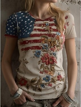 Unabhängigkeitstag Patriotisches Damen T-Shirt Grafische Flagge Vintage Stilvoll Klassisch Kurzärmlig Rundhals V-Ausschnitt Reguläre Tops Alltag Druck Off-White Sommer Frühling Herbst
