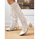 Damenstiefel in weißer Spitze bis zur Mitte der Wade mit hohlen, geschnitzten goldenen Absätzen – elegante Netzstiefel für Hochzeiten, Gartenpartys und viktorianisches Cosplay |