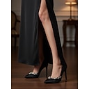 Damen-Pumps mit Blockabsatz aus Satin mit Kristallschleife und Strass-Detail, spitze High Heels für gehobene Partys und Cocktailveranstaltungen |