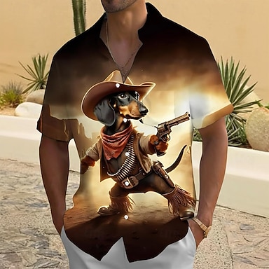 Herren Hund Cowboy Hemd Westernhemd Knopfhemd Kurzarm Vintage-Retro Outdoor Alltagstauglich Sommer Frühling Umlegekragen 3D-Druck Eine Tasche vorne Cowboy-Shirts Braun