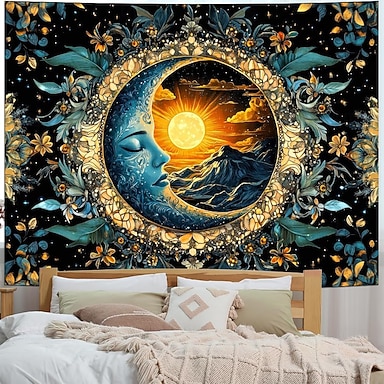 Wandteppich mit himmlischem Sonnen- und Mondmotiv, Halbmondgesicht, Berglandschaft, Sternennacht, ästhetischer Boho-Stil, mystische Schlafzimmerdekoration