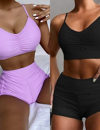 Damen Bikini 2-teiliges Badeanzug Raffung Unterdraht Shorts Schlank Rücklos Urlaub Strandbekleidung Einfarbige V-Ausschnitt Ärmelloses Badeanzug