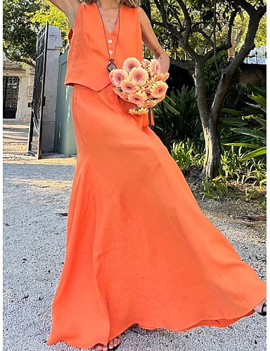 Damen Rock-Sets Bolero Kunstbaumwollleinen Ärmellos V Ausschnitt Einfach Gerafft Patchwork Mode Streetwear Lässig Täglich Outdoor Orange Sommer Normale Passform