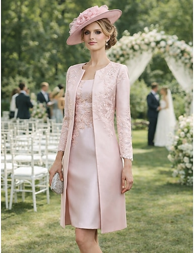 Zweiteilig Schlauchkleid Knielang Kleid für Hochzeitsgäste Brautmutterkleid Ärmellos Rundausschnitt Elegant Übergröße Hochzeitsgast Kirche Satin Spitze Mit Schal Jackenkleider mit Applikationen