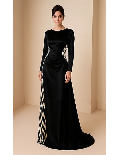 Schlauchkleid Bodenlange Schleppe Abiballkleider Abendkleid Ballkleid Festliche Kleidung Elegant Promi-Stil seidig Langarm U-Boot-Ausschnitt Formell Hochzeit Satin mit Gerafft Druck