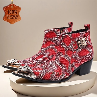 Rote und schwarze Stiefeletten mit Schlangenmuster für Herren und Metalldetails – modisches und auffälliges Design für Weihnachtsfeiern und festliche Anlässe.