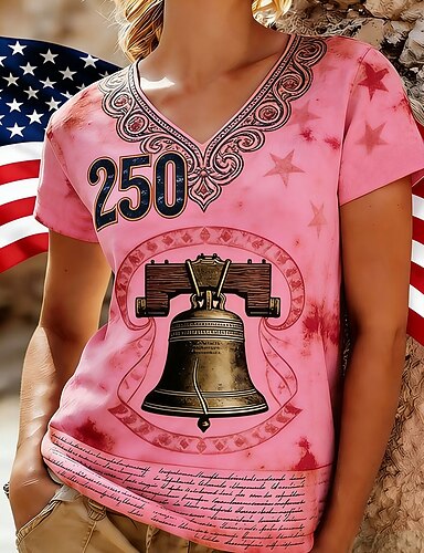 Amerikanischer Unabhängigkeitstag Damen T Shirt Druck Grafik Flagge Vintage Stilvoll Klassisch Kurzarm V Ausschnitt Normale Oberteile Täglich Blau Schwarz Weiß Rosa Rote Sommer Frühling