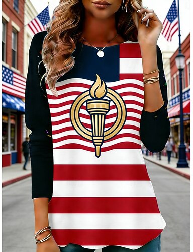 Amerikanischer Unabhängigkeitstag Damen T Shirt T-Shirt Druck Grafik Gestreift Mode Stilvoll Klassisch Langarm Rundhalsausschnitt Normale Oberteile Täglich Wochenende Urlaubskleidung Rote Frühling