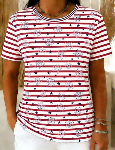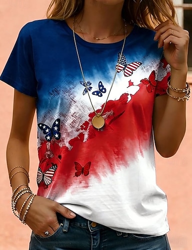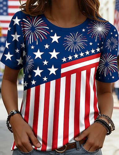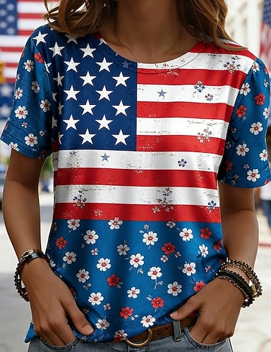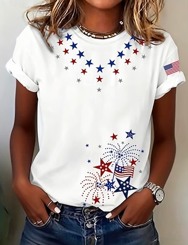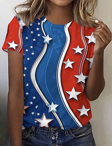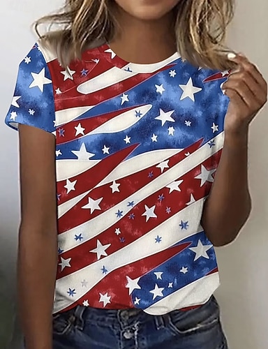 Amerikanischer Unabhängigkeitstag Damen T Shirt Druck Grafik Flagge Amerikanische Flagge Stilvoll Klassisch Lässig Kurzarm Rundhalsausschnitt Normale Oberteile Täglich Blau Rote Sommer Frühling