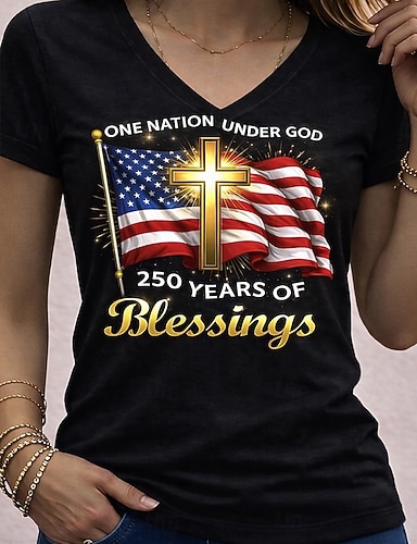 Amerikanischer Unabhängigkeitstag Damen T Shirt Druck Grafik Flagge Vintage Stilvoll Lässig Kurzarm V Ausschnitt Normale Oberteile Täglich Schwarz Weiß Wein Rote Tintenblau Sommer Frühling
