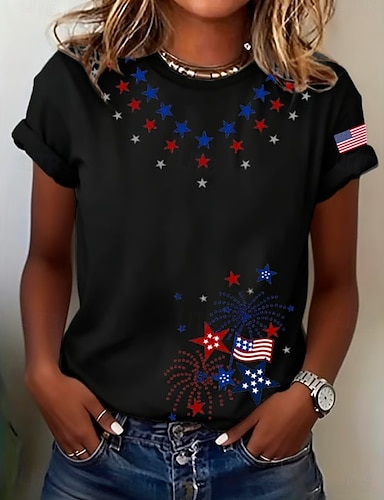 Amerikanischer Unabhängigkeitstag Damen T Shirt Druck Grafik Buchstabe Amerikanische Flagge Stilvoll Lässig Kurzarm Rundhalsausschnitt Normale Oberteile Täglich Schwarz Rote Sommer Frühling