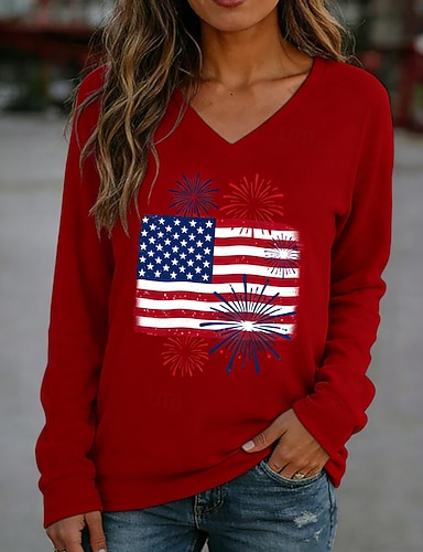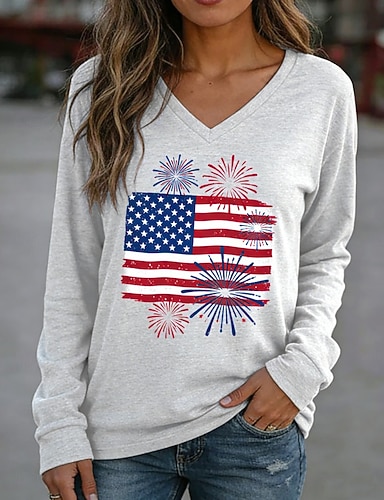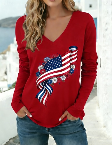 Amerikanischer Unabhängigkeitstag Damen T Shirt T-Shirt Druck Grafik Flagge Stilvoll Klassisch Lässig Langarm V Ausschnitt Normale Oberteile Täglich Ausgehen Wochenende Rote Marineblau Hellgrau