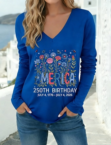 Amerikanischer Unabhängigkeitstag Damen T Shirt T-Shirt Druck Blumen Amerikanische Flagge Stilvoll Klassisch Lässig Langarm V Ausschnitt Normale Oberteile Täglich Ausgehen Rote Marineblau Khaki