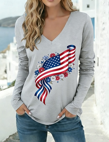 Amerikanischer Unabhängigkeitstag Damen T Shirt T-Shirt Druck Grafik Amerikanische Flagge Stilvoll Klassisch Lässig Langarm V Ausschnitt Normale Oberteile Täglich Sport Ausgehen Blau Rote Hellgrau