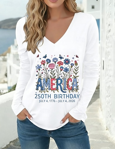 Amerikanischer Unabhängigkeitstag Damen T Shirt T-Shirt Druck Grafik Amerikanische Flagge Stilvoll Klassisch Lässig Langarm V Ausschnitt Normale Oberteile Täglich Ausgehen Wochenende Weiß Rote