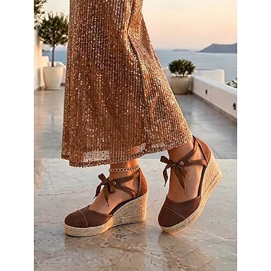 Braune Espadrille-Sandalen mit Keilabsatz und Schleifen an den Knöcheln – perfekt für den Urlaub &Abendschuhe fürs Resort