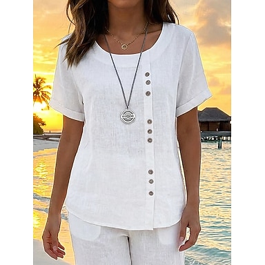 Damen Hemd Baumwoll Mischung Bluse Knöpfe Einfach Basic Modern Kurzarm Rundhalsausschnitt Normale Oberteile Täglich Ferien Blau Weiß Rosa Orange Grün Sommer