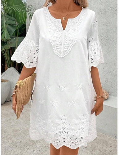 Damen Knielanges Kleid Weißes Spitzenkleid Kleid mit Lochstickerei Elegant Mode Modern Outdoor Urlaub Ausgehen Normale Passform Einfach Halbarm V Ausschnitt Weiß Sommer Frühling