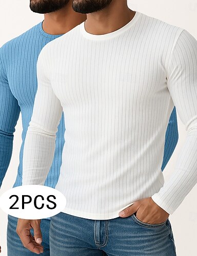 Herren T Shirt Muskelshirt Geripptes Strick-T-Shirt T-Shirt Langarm Rundhalsausschnitt Frühling Herbst Ganzjahres Einfarbig Einfach Texture Mode Designer Basic 2 teilig Mehrfachpackung Stricken