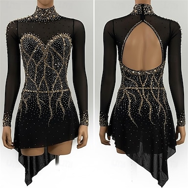 Eiskunstlaufkleid Damen Mädchen Eislaufen Kleid Schwarz Asymmetrischer Saum Netzstoff Hohe Elastizität Training Wettbewerb Eiskunstlaufkleidung Klassisch Kristall / Strass Langarm Eislaufen