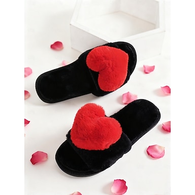 Schwarze, flauschige Damen-Pantoletten aus Kunstfell mit rotem Plüschherz – kuschelige, warme Hausschuhe mit offener Zehenpartie, ideal als romantisches Valentinstagsgeschenk, für drinnen und fürs Schlafzimmer.