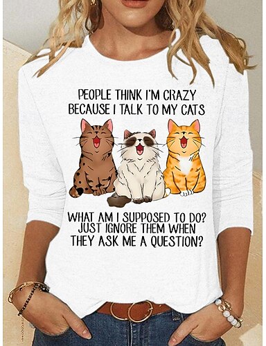 Damen Tunika T-Shirt Mode Lässig Katze Reguläre Oberteile Langarm Rundhalsausschnitt Druck Lockere Passform täglich Weiß Frühling Herbst