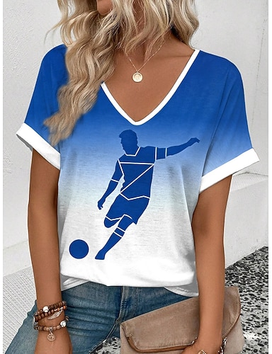 Weltfußballspiel 2026 Damen T-Shirt Print Ombre Grafik Farbblock Vintage Stilvoll Klassisch Kurzarm V-Ausschnitt Reguläre Oberteile Tägliche Wochenende Urlaubsbekleidung Blau Weiß-Blau Weiß Sommer