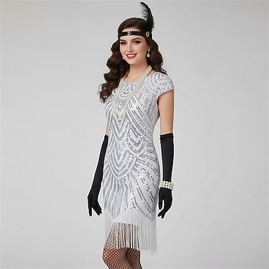 Set Goldene Zwanziger 1920er Knielang Kleid Flapper Kleid Outfits mit Zubehör Cap-Ärmel Der große Gatsby Hochzeitsgast Quastenfransen V Ausschnitt Rundausschnitt Kostüm Damen Karneval Maskerade