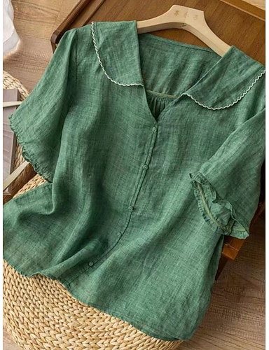 Damen Leinenähnliches Faux Baumwoll Leinen Hemden Knöpfe Unifarben Täglich Basic Lässig Halbarm Hemd Kragen Regulär Oberteile Täglich Blau Weiß Pink Orange Grün Sommer Frühling Herbst