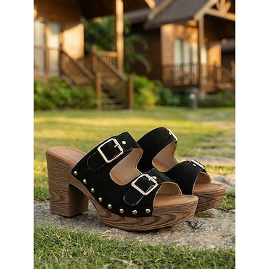 Elegante schwarze Plateau-Sandalen für Damen mit doppelter Schnalle – bequeme Pantoletten mit Blockabsatz in Holzoptik und Nietenbesatz für Outdoor-Resorts und tropische Urlaube &Sommergartenpartys