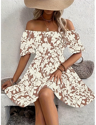 Damen Minikleid A Linie Kleid Lässig Outdoor Ausgehen Standard Passform Blumen Grafik Kurzarm Schulterfrei Blau Rote Grün Beige Sommer Frühling