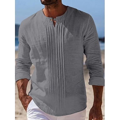 Herren Hemd Leinenhemd Sommerhemd Strandhemd Einfarbig Lässig Urlaub Blau Schwarz Weiß Khaki Langarm Mandarinkragen Sommer Frühling Bekleidung Gerafft
