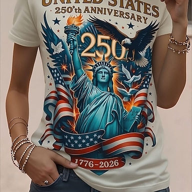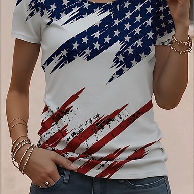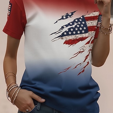 Amerikanischer Unabhängigkeitstag Damen T Shirt Druck Grafik Flagge Stilvoll Klassisch Lässig Kurzarm V Ausschnitt Normale Oberteile Täglich Blau Braun Rot / Blau Sommer Frühling