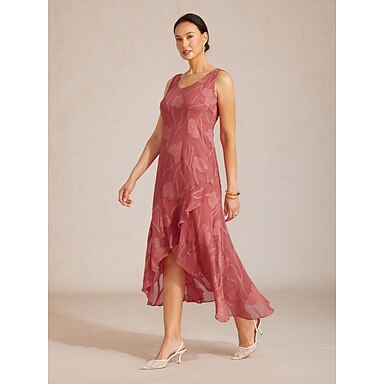 Damen Maxikleid Chiffonkleid Elegant Blumen Ärmellos U-Ausschnitt Koralle Rot