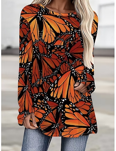 Damen T Shirt Druck Grafik Tiermotiv Schmetterling Vintage Stilvoll Klassisch Langarm Rundhalsausschnitt Rundhals Normale Oberteile Täglich Schwarz Orange Frühling Herbst