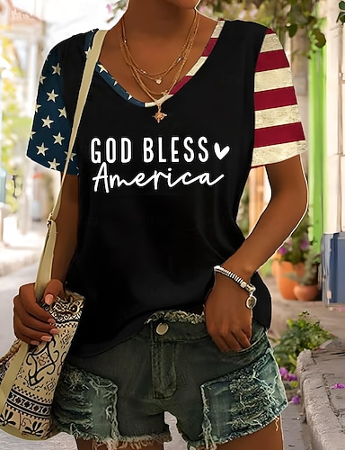 Unabhängigkeitstag Patriotisches Damen T-Shirt Graphic Flagge Vintage Stilvoll Klassisch Kurzarm V-Ausschnitt Reguläre Oberteile Alltagswochenende Druck Schwarz Weiß Gelb Blau Sommer Frühling